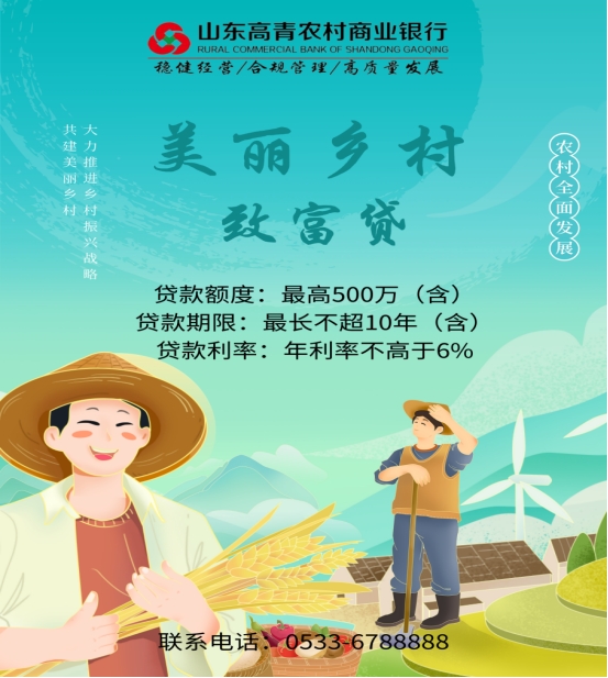 为提高村集体经济收入,带动村民致富增收,助力村党支部领办合作社发展,高青农村商业银行推出了向村党组织领办合作社、股份制经济合作社等组织提供信贷资金的贷款产品“美丽乡村致富贷”,是用于农业生产(包括农林牧渔生产和农田建设)及与农业生产直接相关的产业融合项目(包括向农业生产者提供农资、农技、农机,农产品收购、仓储保鲜、销售、初加工,以及农业新业态等服务的项目)、清洁能源开发利用的绿色循环经济类贷款。